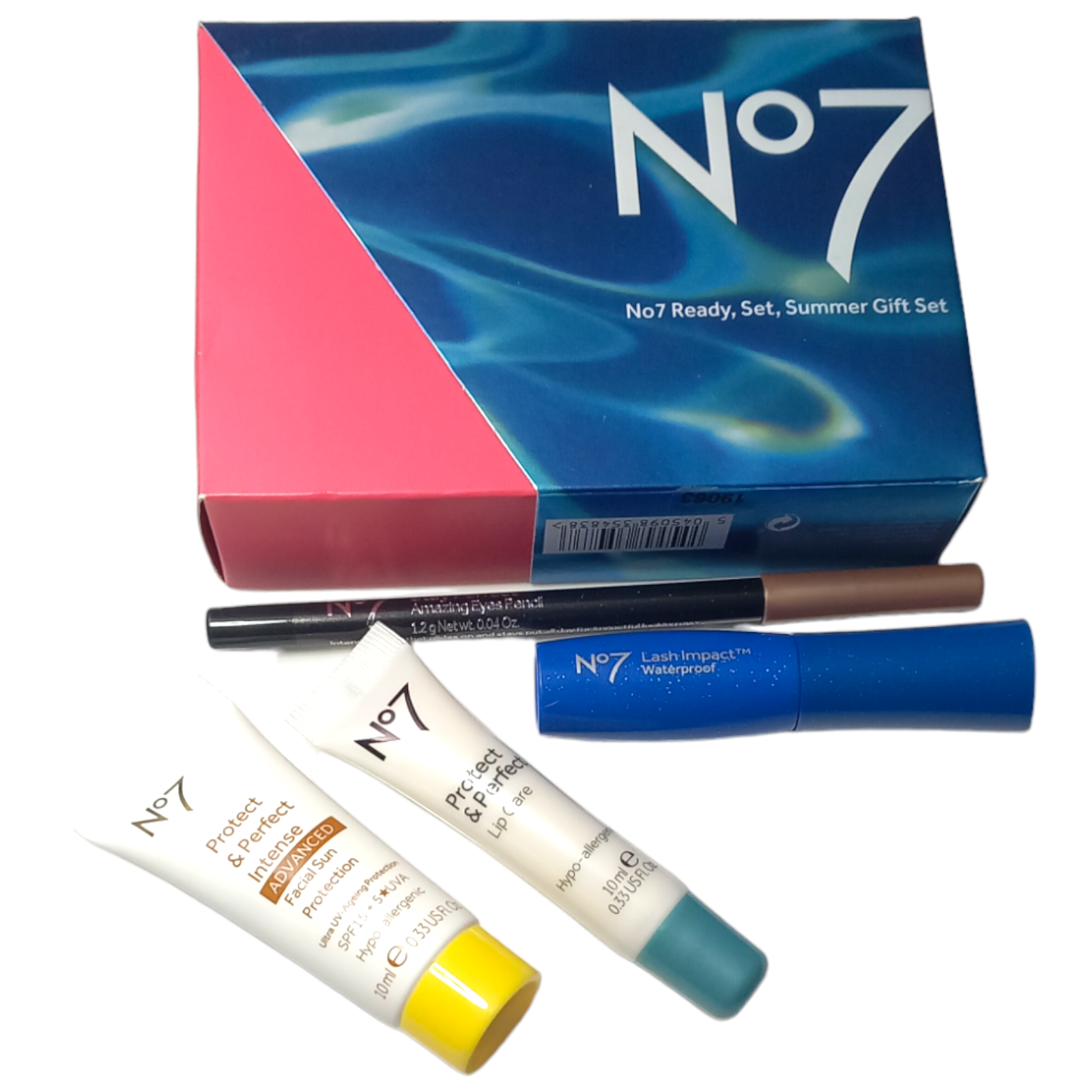 This set includes:1x No7 Lash Impact Waterproof Mascara Mini 4.5ml 1x No7 Stay Perfect Amazing Eyes Pencil Bronze 1.2g (Full Size) 1x No7 Protect and Perfect Intense ADVANCED Facial Sun Protection SPF15 10ml 1x No7 Protect and Perfect Lip Cream 10ml 1x Gift Set