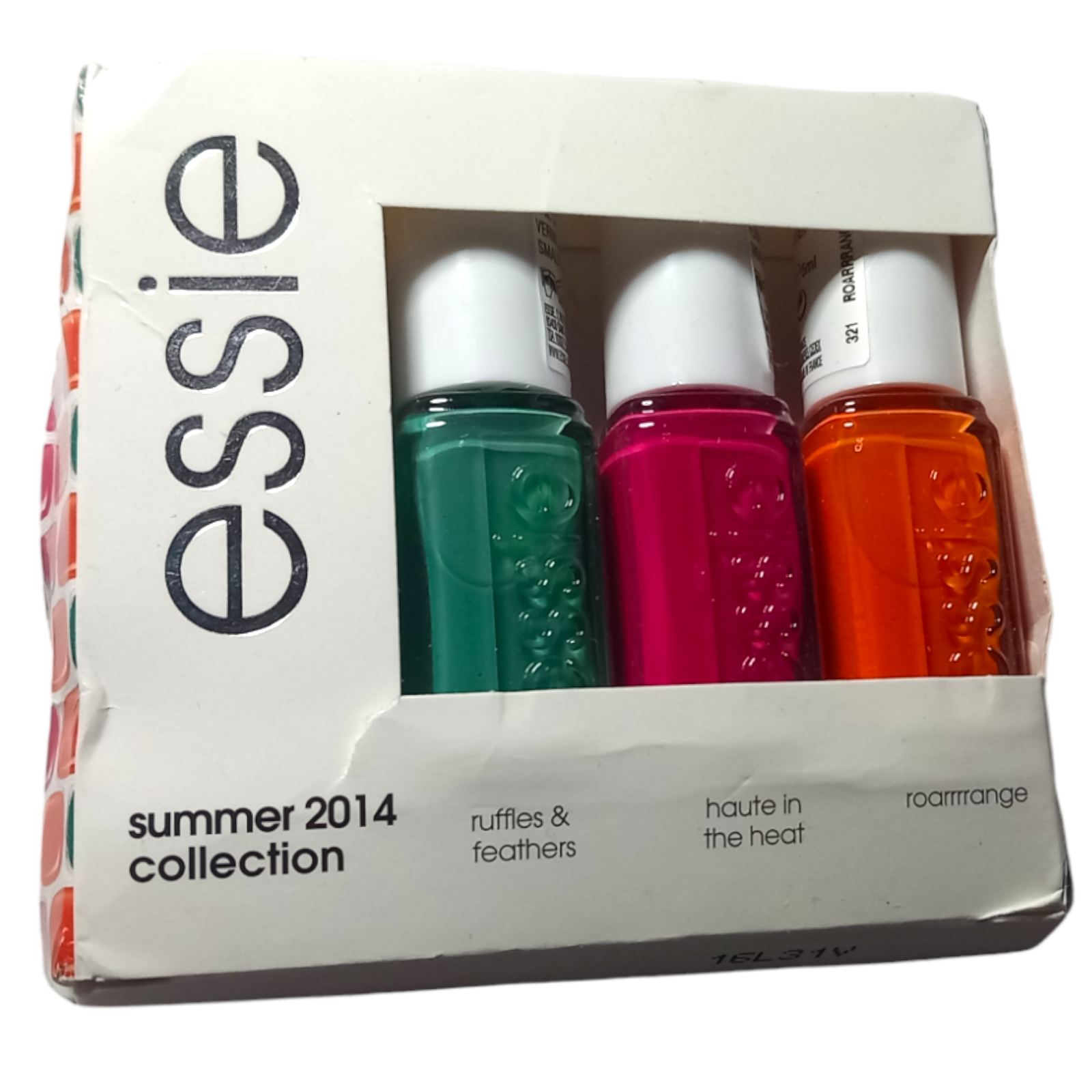 Set contains the following shades:Ruffles and Feathers (Green) Haute In The Heat (Pink) Roarrrrange (Orange) essie is the go-to nail varnish brand for make-up junkies, industry experts and fashion icons all over the world.The brand aims to inspire a love for the manicure experience with its salon-worthy formula and innovative nail polish shades.Our founder Essie Weingarten debuted 12 shades in Las Vegas, Nevada in pursuit of one goal: to help women feel special and to give them the perfect manicure.Some of the original shades are still in the range today.essie is a cult favourite amongst celebrities and fashion designers making numerous appearances on the catwalk, red carpet and even down the aisle.Discover over 100 witty named nail colours, making it easy to find the perfect shade for any occasion and for the trendsetters, make sure to keep an eye on essies limited edition collections.They launch a selection of seasonal shades throughout the year available for a limited time only.