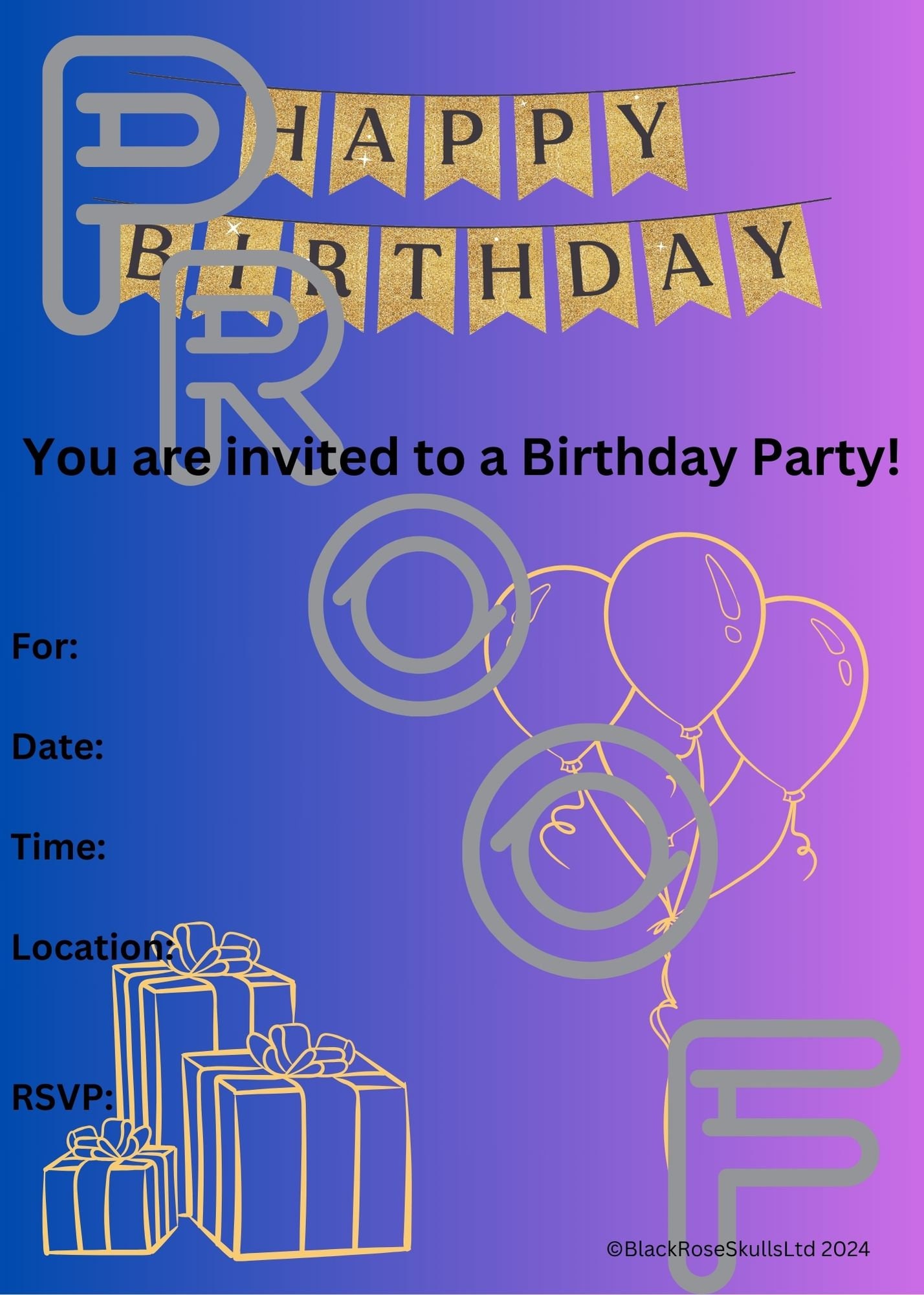 Reusable Birthday Party Invitation: Gold, Blue, Purple (PDF Digital Download)