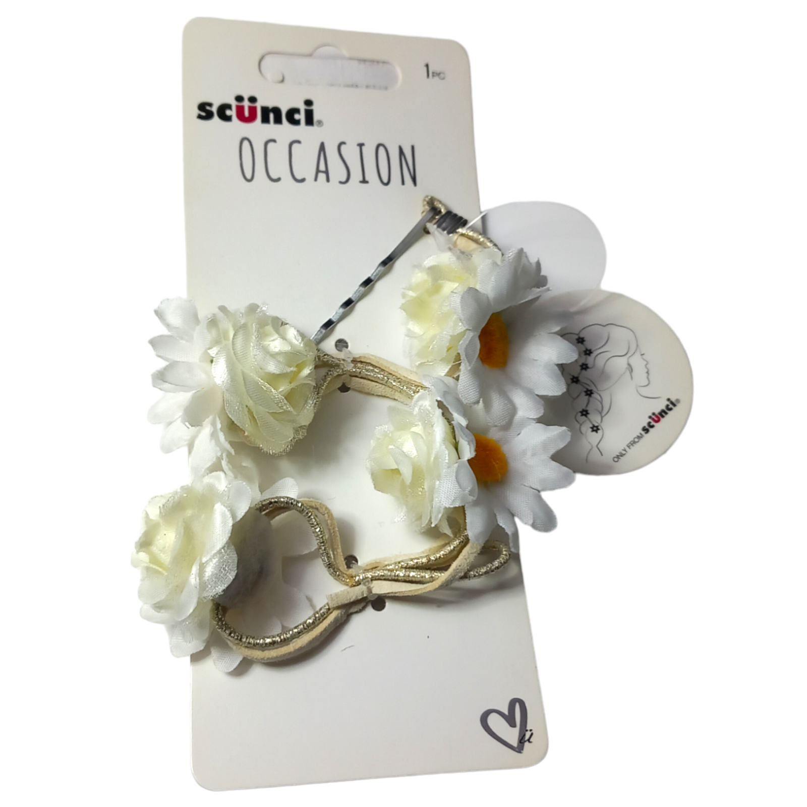 Scunci Occasion Floral Hair SwagBrand NEWDesign: DaisyDaisy flower pinGreat for updos1x Hair AccessoryDisclaimer: Products may vary slightly from their pictures. The images of the products on our website are for illustrative purposes only. Although we have made every effort to display the colours accurately, we cannot guarantee that a device’s display of the colours accurately reflects the colour of the products. Your product may vary slightly from those images.